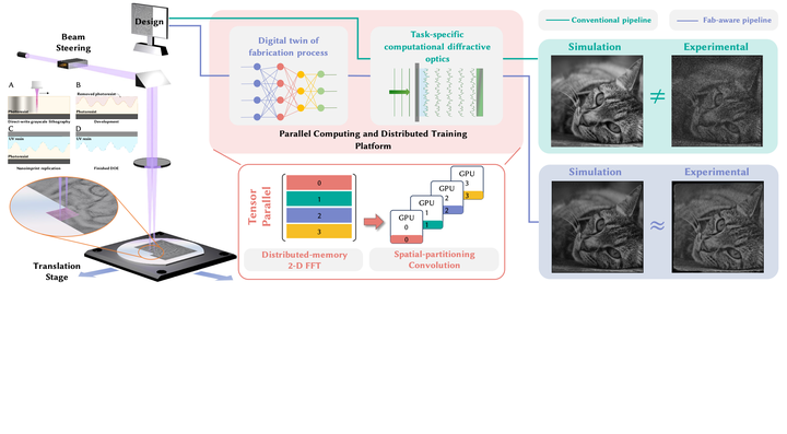 Differentiable optics, as an emerging paradigm that jointly optimizes optics and (optional) image processing algorithms, has made innovative optical designs possible across a broad range of applications. Many of these systems utilize diffractive optical components (DOEs) for holography, PSF engineering, or wavefront shaping. Existing approaches have, however, mostly remained limited to laboratory prototypes, owing to a large quality gap between simulation and manufactured devices. We aim at lifting the fundamental technical barriers to the practical use of learned diffractive optical systems. To this end, we propose a fabrication-aware design pipeline for diffractive optics fabricated by direct-write grayscale lithography followed by nano-imprinting replication, which is directly suited for inexpensive mass production of large area designs. We propose a super-resolved neural lithography model that can accurately predict the 3D geometry generated by the fabrication process. This model can be seamlessly integrated into existing differentiable optics frameworks, enabling fabrication-aware, end-to-end optimization of computational optical systems. To tackle the computational challenges, we also devise tensor-parallel compute framework centered on distributing large-scale FFT computation across many GPUs. As such, we demonstrate large scale diffractive optics designs up to 32.16 mm × 21.44 mm, simulated on grids of up to 128,640 by 85,760 feature points. We find adequate agreement between simulation and fabricated prototypes for applications such as holography and PSF engineering. We also achieve high image quality from an imaging system comprised only of a single DOE, with images processed only by a Wiener filter utilizing the simulation PSF. We believe our findings lift the fabrication limitations for real-world applications of diffractive optics and differentiable optical design.